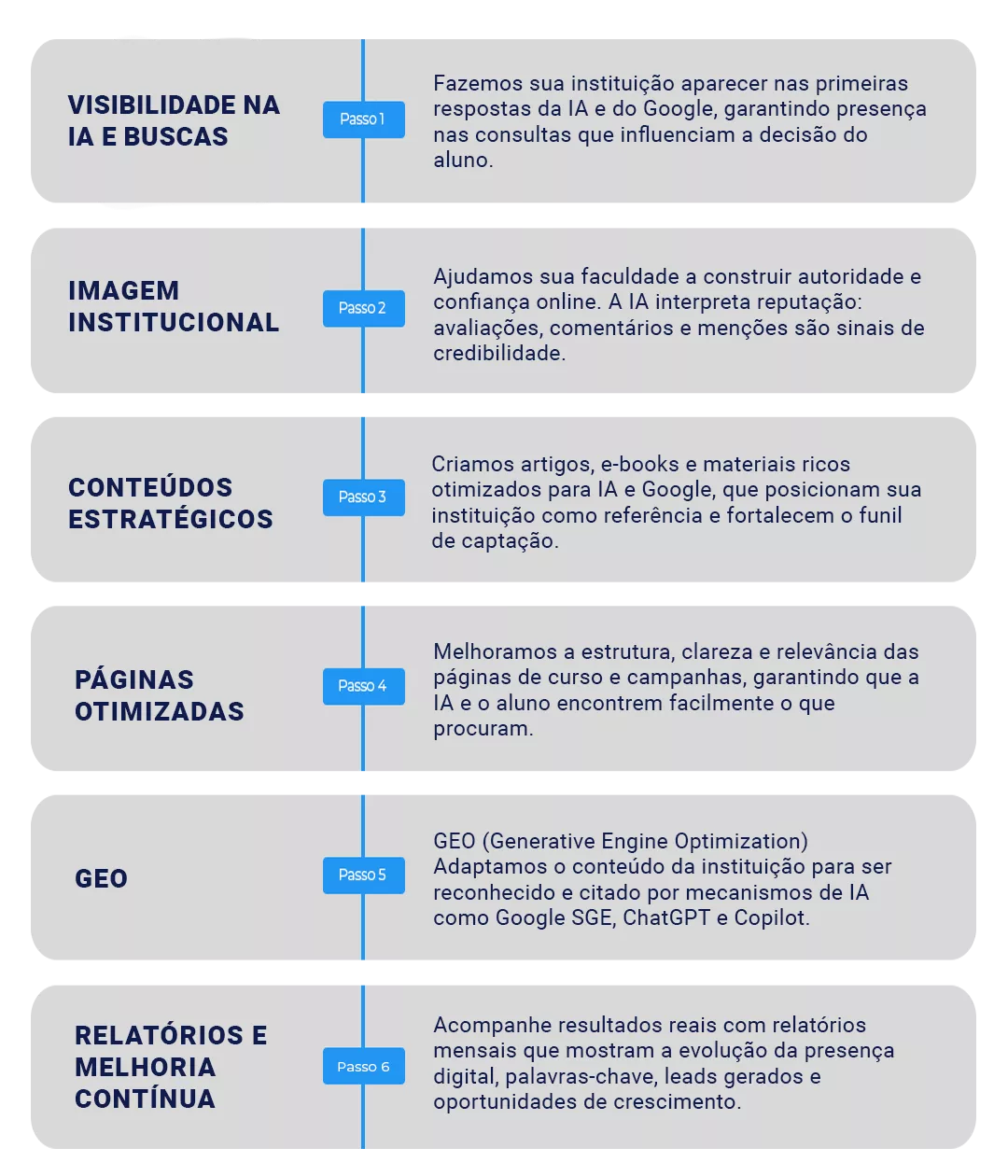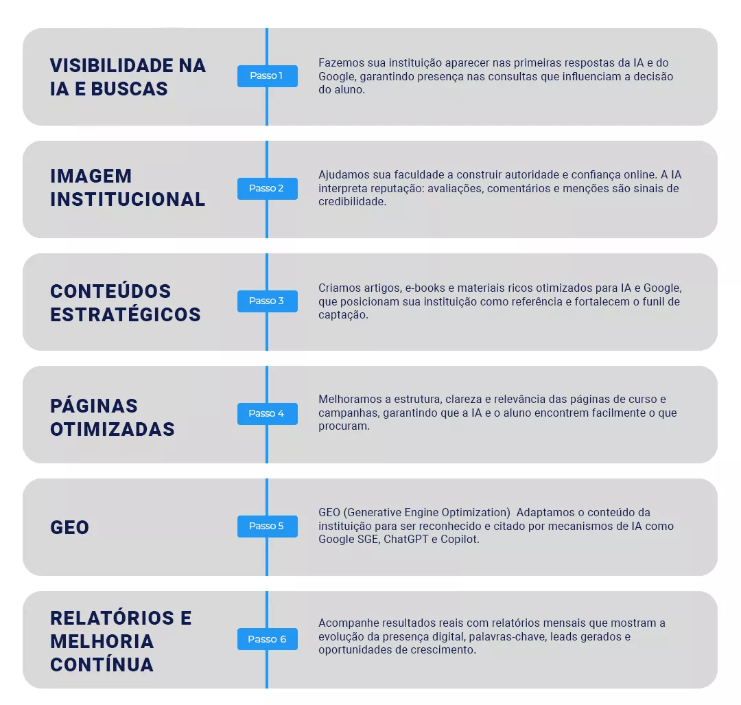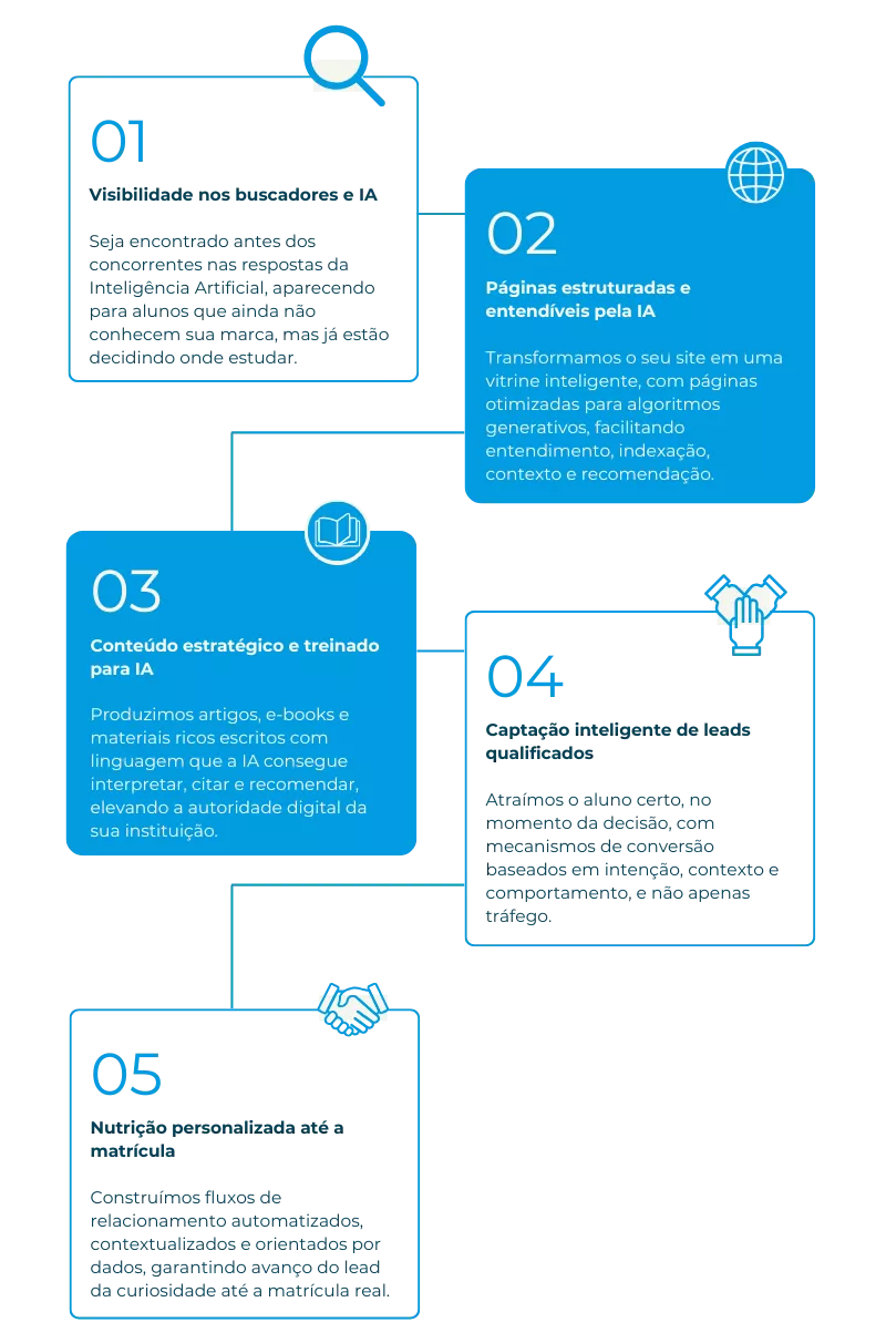 Nosso foco é fazer sua instituição ser reconhecida e recomendada pela IA e pelos buscadores, garantindo matrículas com menor investimento.